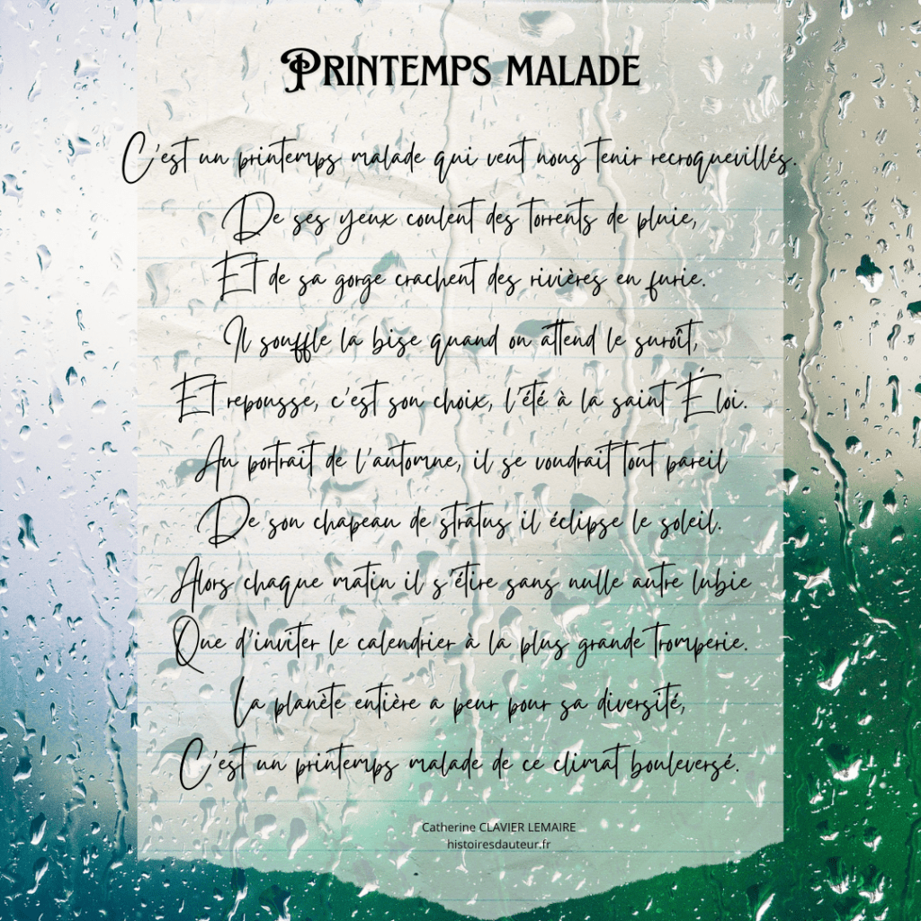 Ce serait aujourd’hui le dernier jour du printemps ? Cette année je crois que le ciel nous a fait une farce mais on ne peut plus en rire. Ce dérèglement du temps n’attend plus qu’on réfléchisse, il veut nous faire agir. De mon côté à la campagne j’adopte tous les gestes possibles à la maison comme au potager, alors maintenant peut-être puis-je engager mes mots…